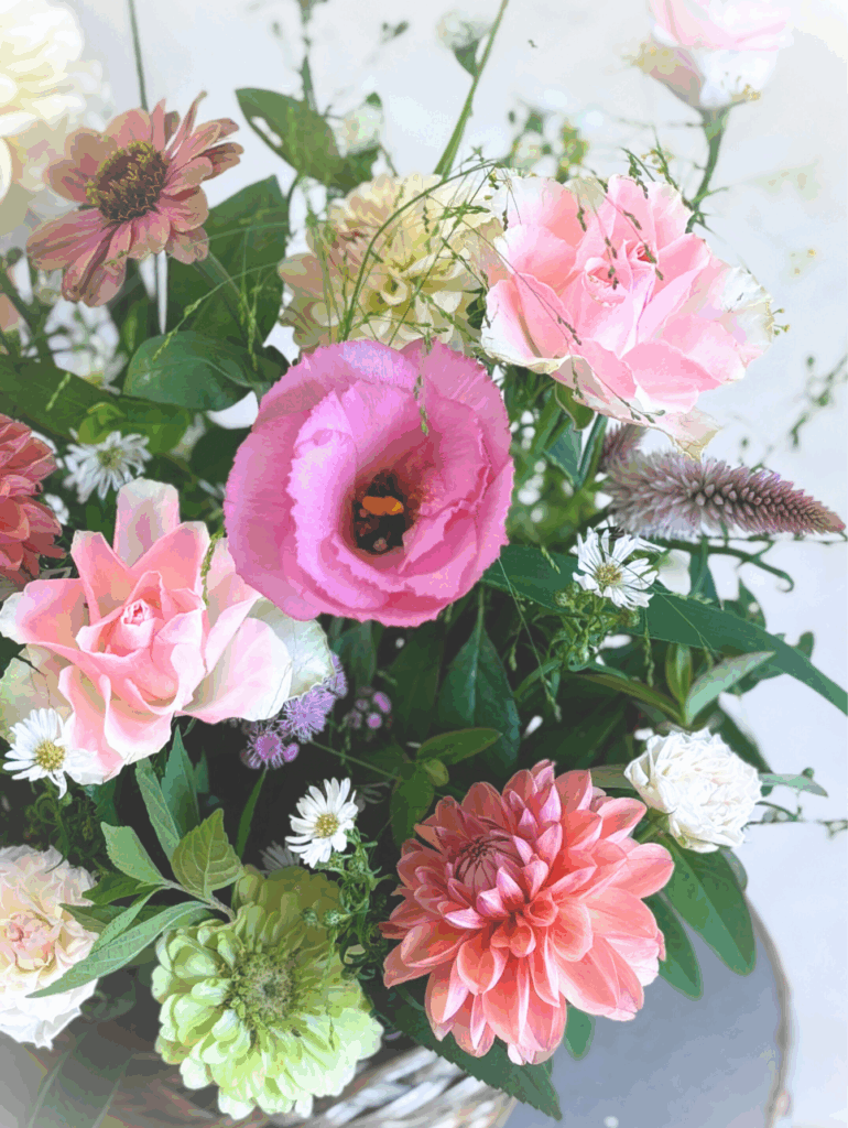八ヶ岳の季節のお花に柔らかなピンクのバラとトルコキキョウを添えて、やさしく華やかな色合いで、見ているだけで心がふんわりと明るくなるようなアレンジに仕上がりました。